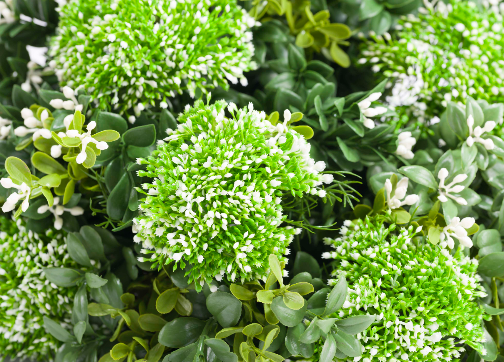 Lush green plants meet subtle white flowers in this beautiful green wall panel.